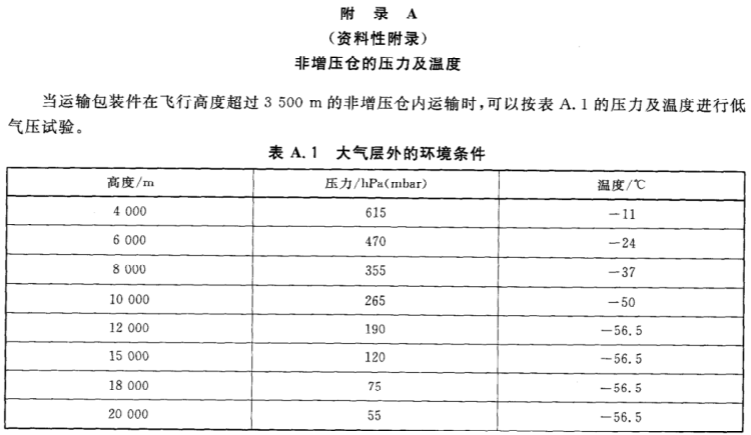 在空運(yùn)時增壓倉和飛行高度不超過3500m的非增壓倉飛機(jī)內(nèi)的運(yùn)輸包裝件和單貨物耐低氣壓的影響的能力及包裝對內(nèi)裝物的保護(hù)能力。對于海拔較高的地面運(yùn)輸包裝件和單貨物可參照本部分進(jìn)行低氣壓試驗。